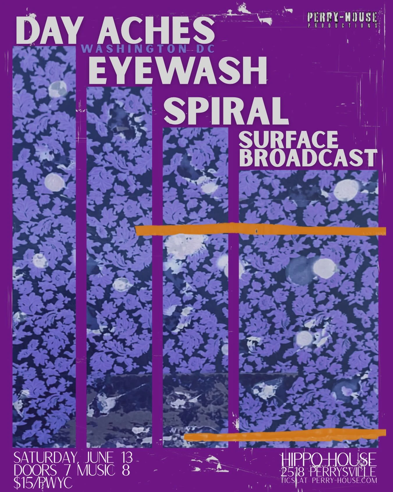Four-band indie/punk showcase at Hippo House featuring Day Aches from Washington DC alongside local acts Eyewash, Spiral, and Surface Broadcast.