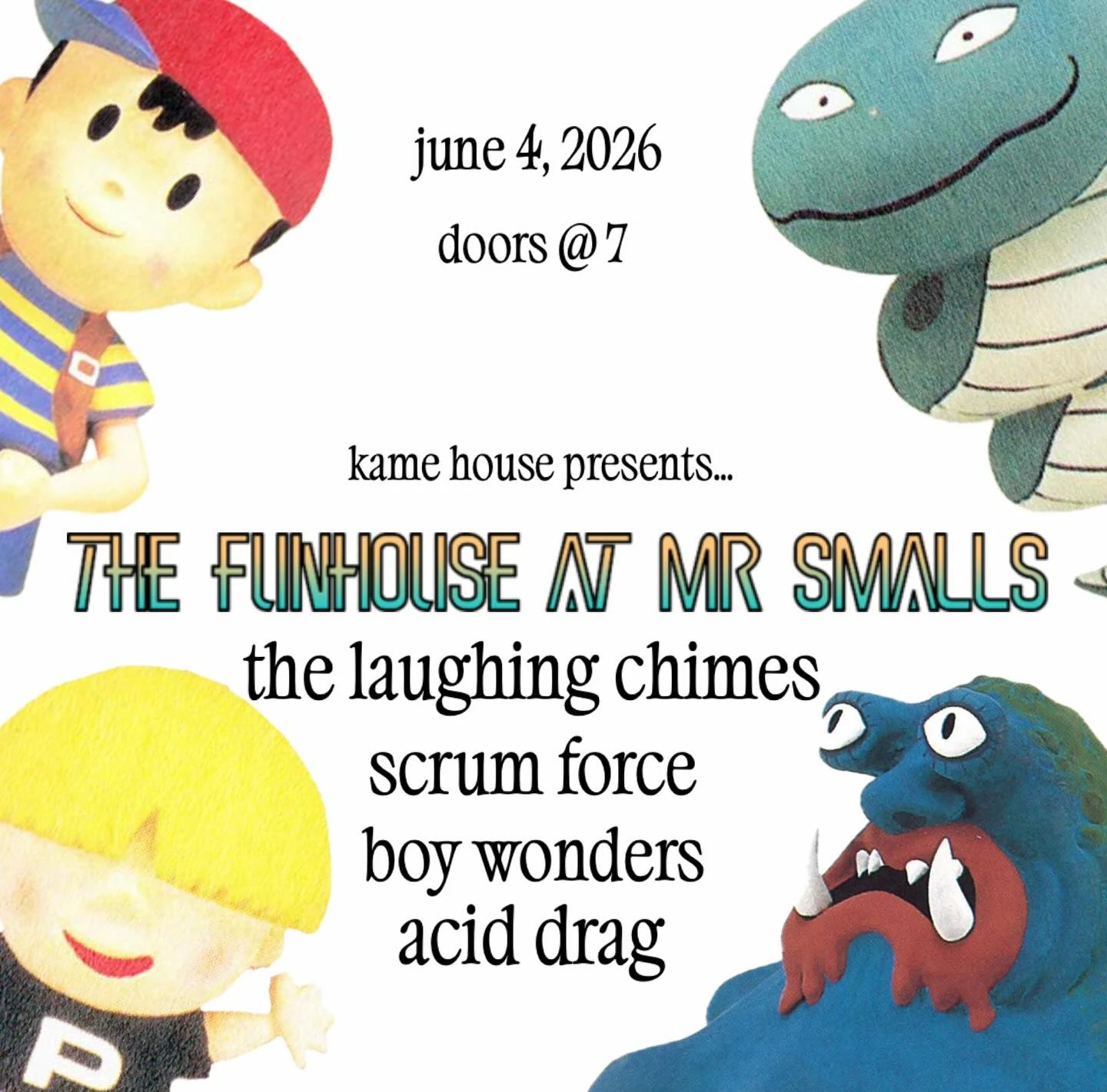Kame House presents The Funhouse at Mr. Smalls featuring The Laughing Chimes, Scrum Force, Boy Wonders, and Acid Drag.