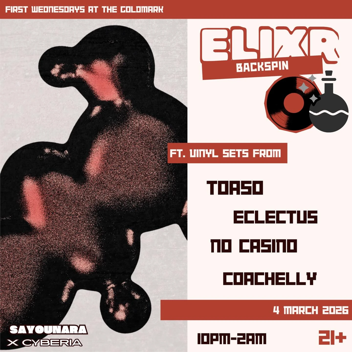 Elixir Backspin First Wednesdays vinyl night at Goldmark. Club Night Wednesday, March 4, 2026 at 10:00 PM - 2:00 AM Goldmark 21+ Goldmark DJ CTOASO Eclectus +2 more Bass Drum And Bass House Jungle