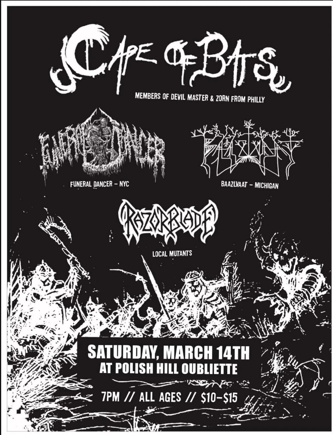 Cape of Bats with Funeral Dancer, Baazlvaat, and Razorblade Cape of Bats headlines Polish Hell Oubliette with Funeral Dancer, Baazlvaat, and Razorblade. Concert Saturday, March 14, 2026 at 7:00 PM Polish Hell Oubliette All Ages Presale: $10 Door: $15 Polish Hell Oubliette Razorblade Black Metal Punk Thrash
