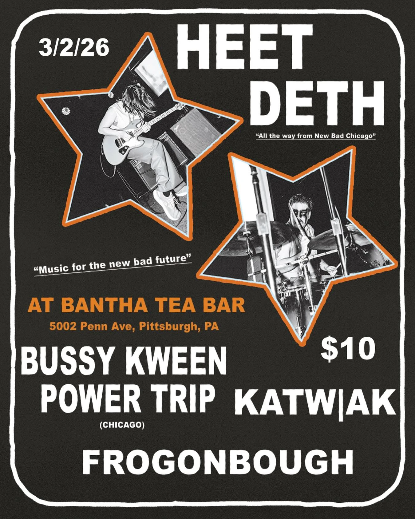 Heet Deth, Bussy Kween Power Trip, katw|ak, frogonbough Chicago rock and noise with local experimental support at Bantha Tea Bar. Concert Monday, March 2, 2026 at 7:00 PM Bantha Tea Bar All Ages Bantha Tea Bar katw|ak frogonbough Diy Electro Experimental Noise Rock