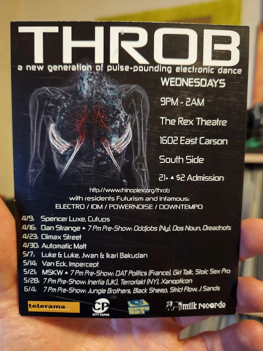 THROB w/ Cutups & Futurism electro night Club Night Wednesday, March 5, 2003 at 9:00 PM - 2:00 AM Rex Theater 18+ Presale: $0 Door: $0 Cutups Rex Theater Futurism Electro