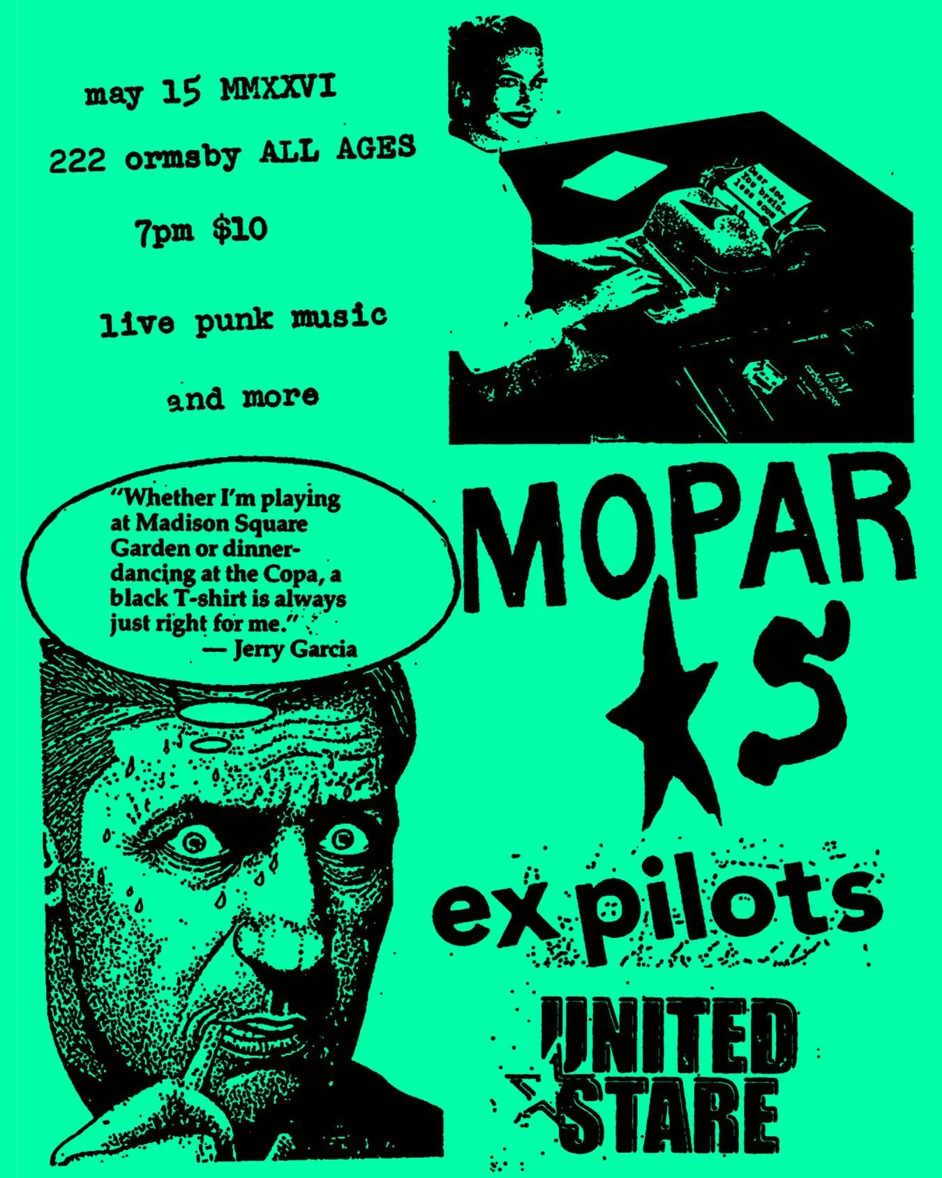An all-ages punk show featuring Mopar, Ex Pilots, and United Stare at 222 Ormsby in Pittsburgh.