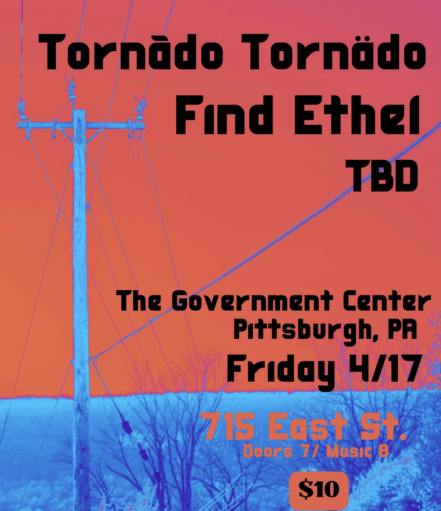 A three-band rock show at The Government Center in Pittsburgh featuring Tornado Tornado, Find Ethel, and a TBD opener.