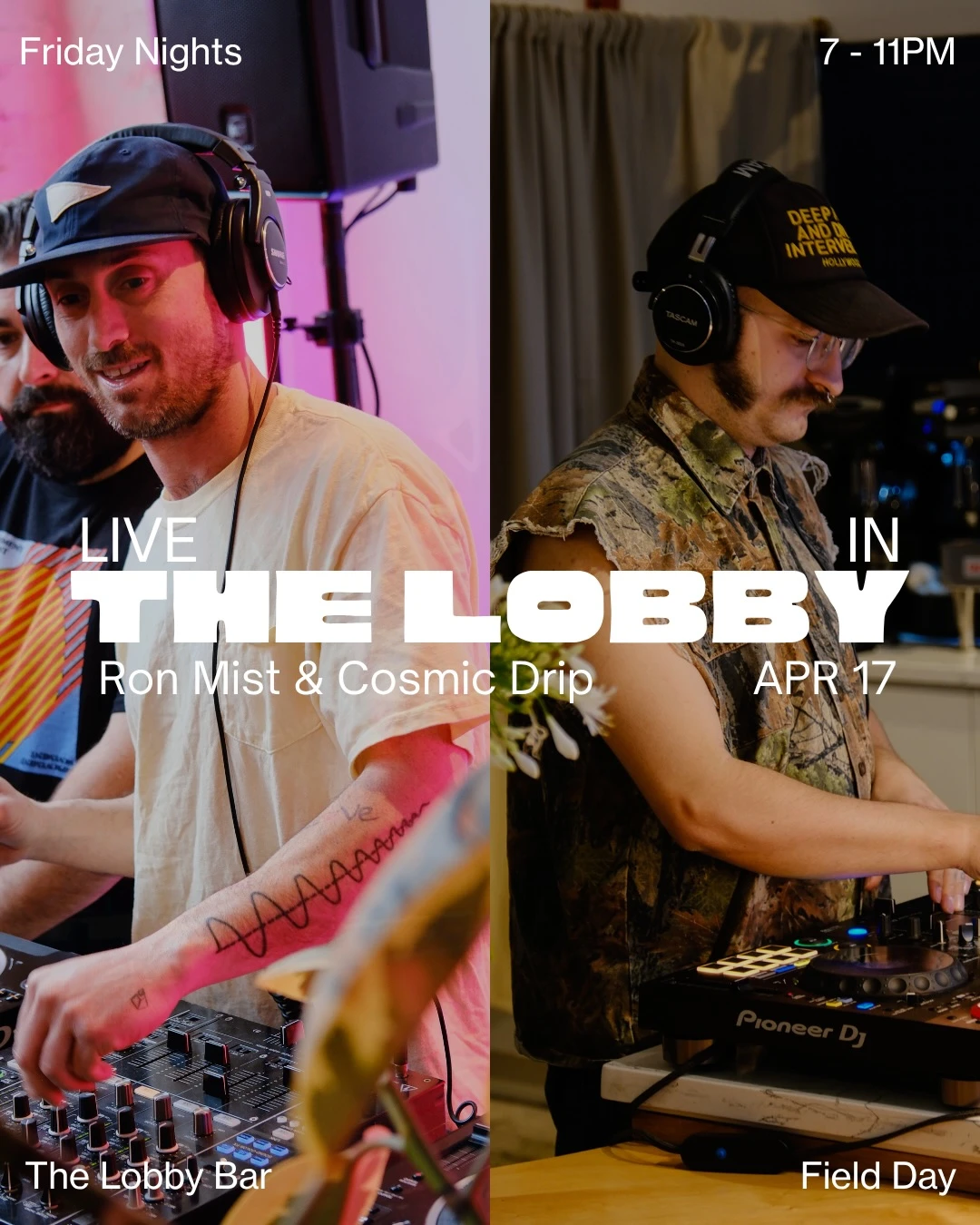 Ron Mist and Cosmic Drip spin back-to-back DJ sets at The Lobby Bar on Friday, April 17 from 7–11PM.