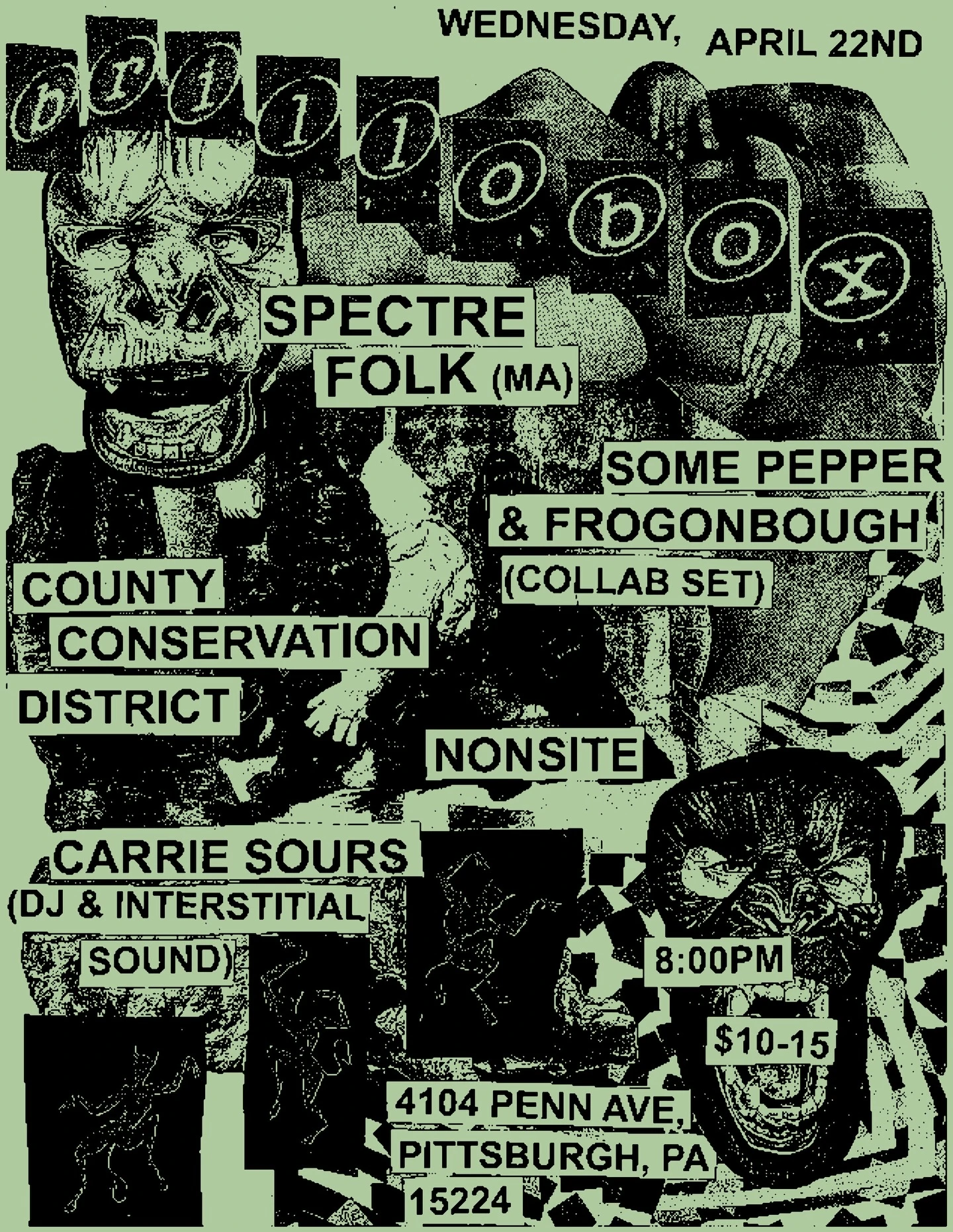 An eclectic experimental music night at Brio Box featuring Spectre Folk (MA), a collab set from Some Pepper & Frogonbough, County Conservation District, Nonsite, and DJ Carrie Sours.