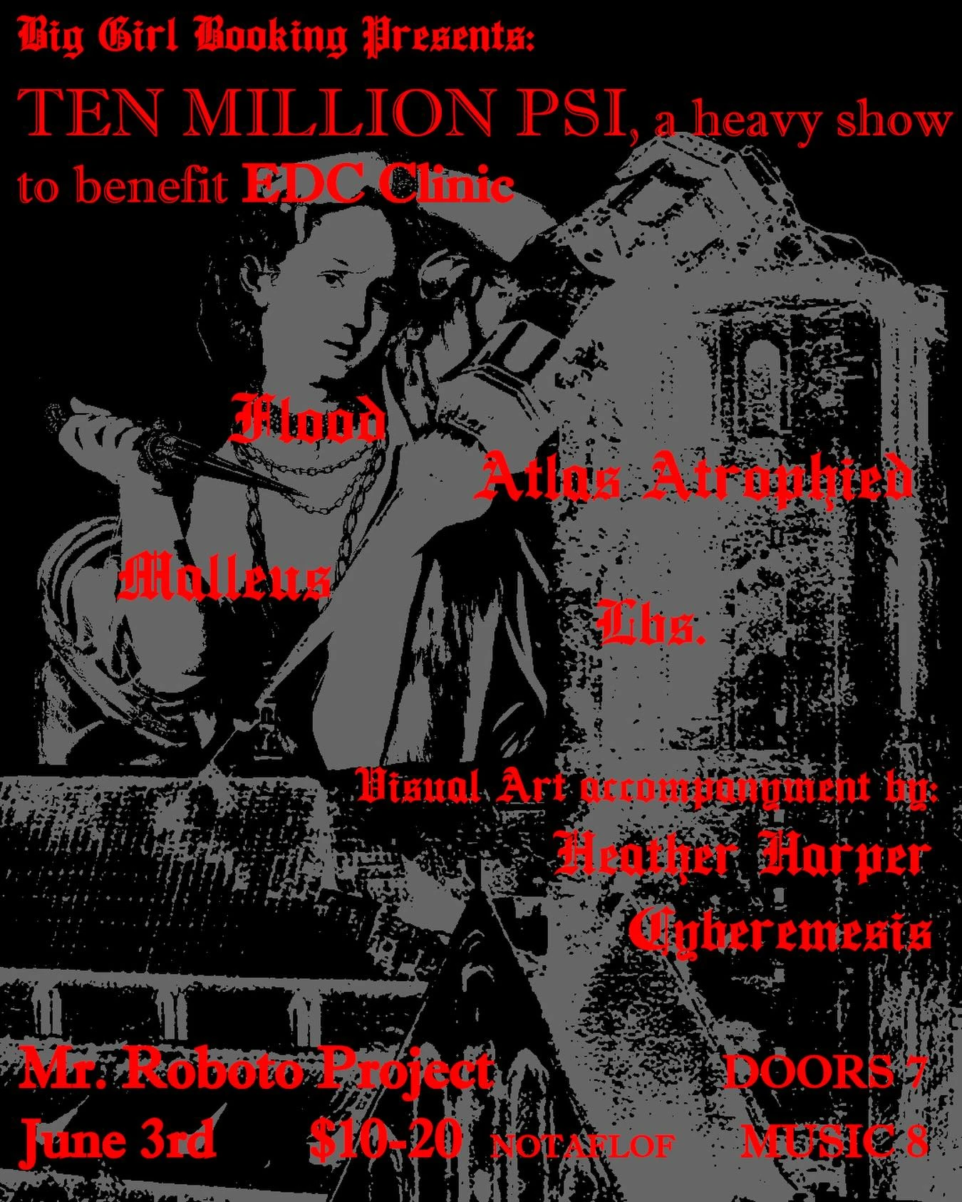 A heavy music benefit show for EDC Clinic featuring Flood, Atlas Atrophied, Malleus, Lbs., and visual art by Heather Harper and Cyberemesis.