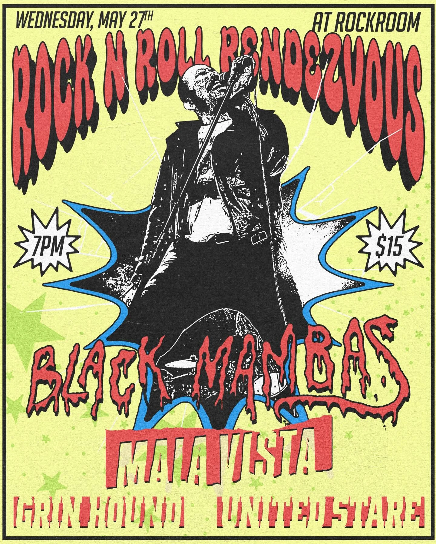 A high-energy rock night at Rockroom featuring Black Mambas, Mala Vista, Grinhound, and United Stare.